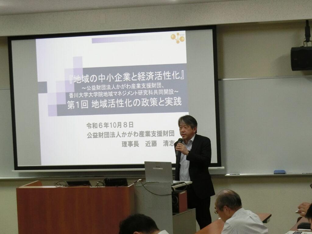 香川大学大学院地域マネジメント研究科(MBA)と連携し、地域を担う人材を育成することを目的として、平成27年度から、企業経営等の第一線で活躍している講師による授業科目「地域の中小企業と経済活性化」を地域マネジメント研究科における提供講座として開設しています。
